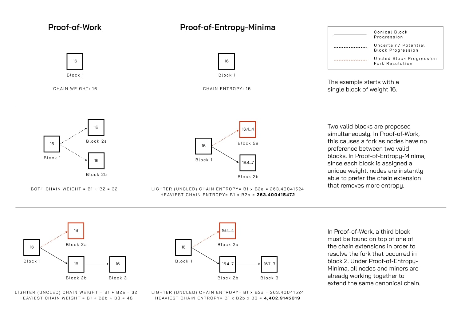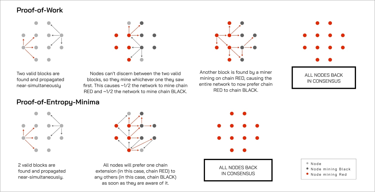 Here’s the key insight: not all valid blocks are actually equal. Even if two blocks both meet the difficulty requirement, one always required slightly more work to create than the other.Traditional Proof-of-Work ignores this difference and treats “good enough” blocks as identical. PoEM measures the exact amount of work (entropy removed) for each block, allowing instant, objective decisions.How PoEM Resolves Forks Instantly: