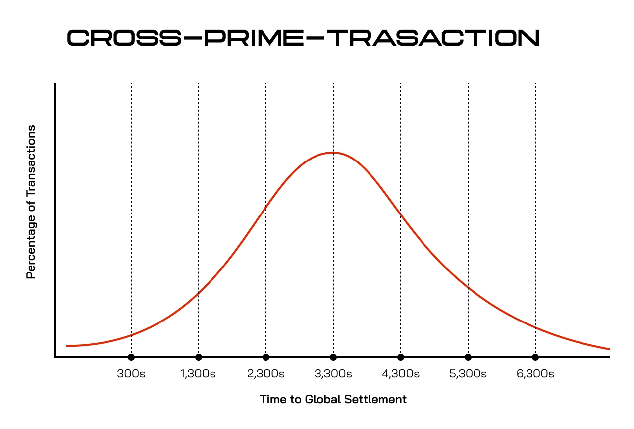 Understanding the Distribution: The diagram below shows how cross-chain transaction times are distributed. While the average global settlement is 3,300 seconds, half of transactions complete faster than this.